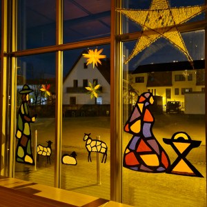 Schon Ende November wurden Gemeindezentrum und Kirche adventlich geschmückt. Besonders gut gefielen Gemeindegliedern und Gästen die großen Fensterbilder zur Weihnachtsgeschichte im Foyer.