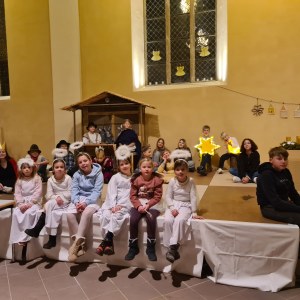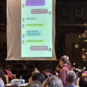 Für das Krippenspiel an Heiligabend hatten sich die Jugendlichen bei der Schreib-Werkstatt einen Chat ausgedacht, der unter der Orgelempore projiziert wurde: Was war eigentlich los vor 2025 Jahren?, fragten sich die Schreibenden. Dann starteten die Kinder mit dem traditionellen Spiel der Weihnachtsgeschichte, das von einem zweiten Chat abgeschlossen wurde.
